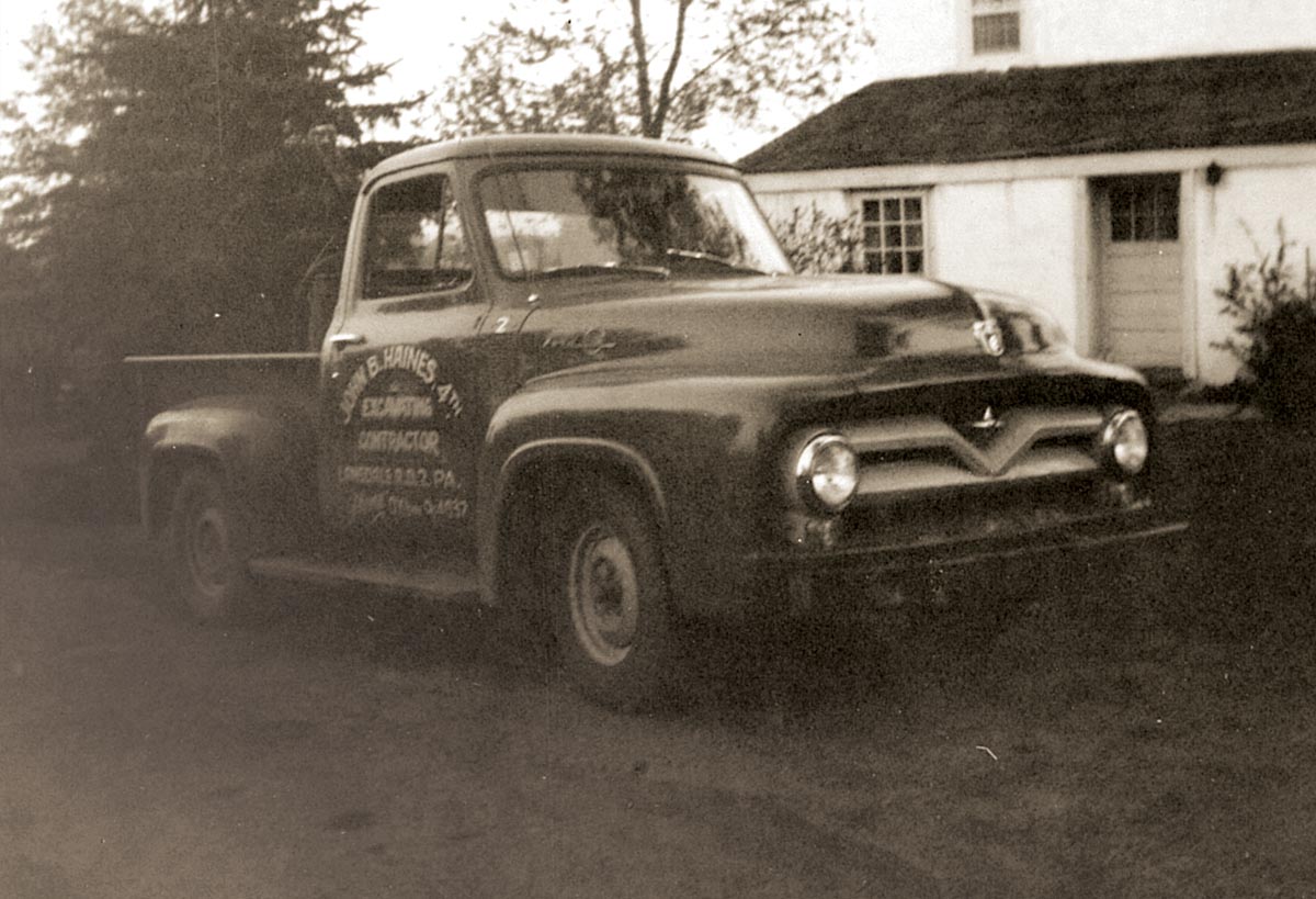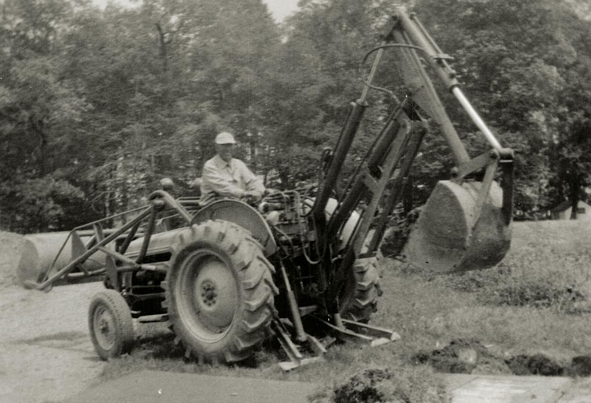 Anthony “Tony” Haines, the father of John B. Haines IV (Founder and Co-Chairman of the Board of H&K Group, Inc.), operates his 9N Ford tractor with backhoe and loader attachments on the family farm in Worcester, PA – circa 1950.